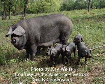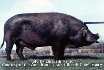 Large Black PigThe Large Black pig is native to Cornwall, Devon, and Somerset in southw The Large Black was used in small scale production of both pork and bacon. It was also valued for commercial crossing, primarily with the Large White breed (called Yorkshire in the United States). This cross yielded great hybrid vigor, and it was well regarded commercially. The breed’s popularity peaked during the 1920s, and the Large Black was exported to several other countries, including Argentina, Australia, Brazil, Germany, New Zealand, South Africa, and the United States. After World War II, however, the shift toward intensive husbandry of pigs led to the decline of outdoor breeds that were not competitive indoors. The Large Black nearly became extinct during the 1960s, and it remains one of the rarest British pig breeds. In 1973 the breed was put on Rare Breed Survival Trust’s critically endangered livestock list.