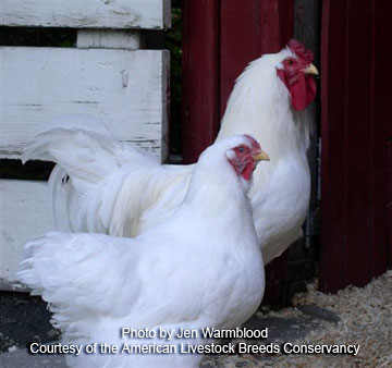 The Rhode Island White originated in 1888 through the efforts of Mr. J. Alonzo Jocoy of Peacedale, Rhode Island. He developed the breed by crossing White Wyandottes with Partridge Cochins and Rose Comb White Leghorns. In 1903, Mr. Jocoy made the breed known to the public and offered individuals for sale. The breed continued to be developed and improved so that it more closely resembled the Rhode Island Red’s brick-like body shape. This distinctive shape helped to prevent the breed from looking similar to and being confused with White Wyandottes or White Plymouth Rock chickens. In 1922 the Rhode Island White was admitted to the American Poultry Association’s Standard of Perfection during the national conference in Knoxville, Tennessee, that year. The Rhode Island White gained some popularity in the US up until the 1960’s, at which time their numbers began to decline. The breed never came close to the overwhelming popularity that the more famous Rhode Island Red chicken achieved.